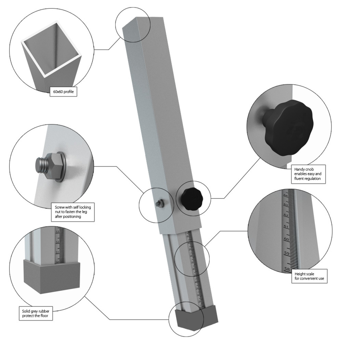 Single telescopic leg, made of square extruded aluminum. Adjustable height from 40 cm up to 60 cm.