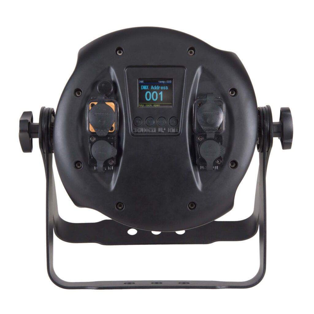 | Structure and cabinet | Die cast aluminum housing, black color Color LCD display Front tempered glass Mounting points: double bracket for suspension or floor support IP rating: IP65 3-poles XLR in/out DMX connection IP65 Convection cooling system without fans |