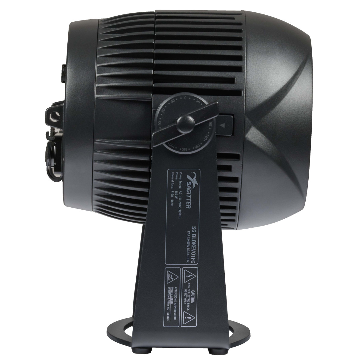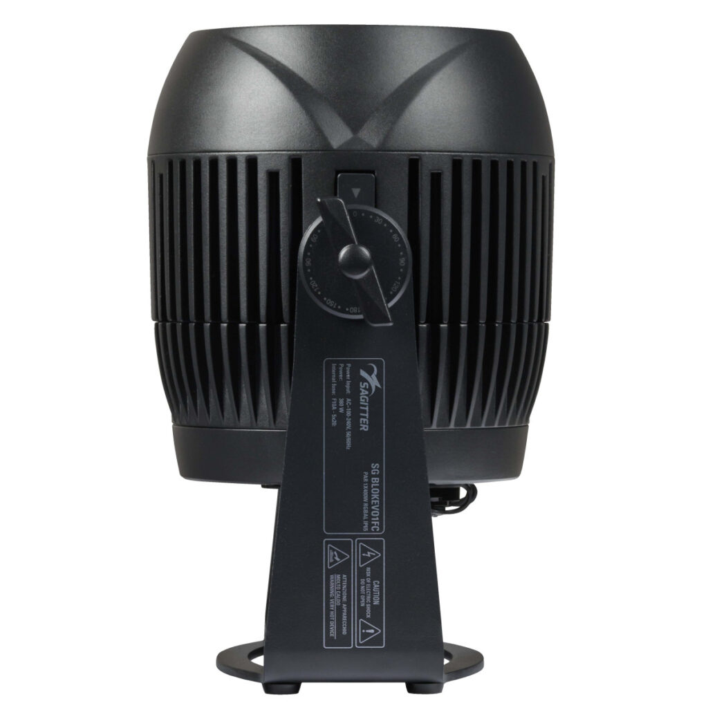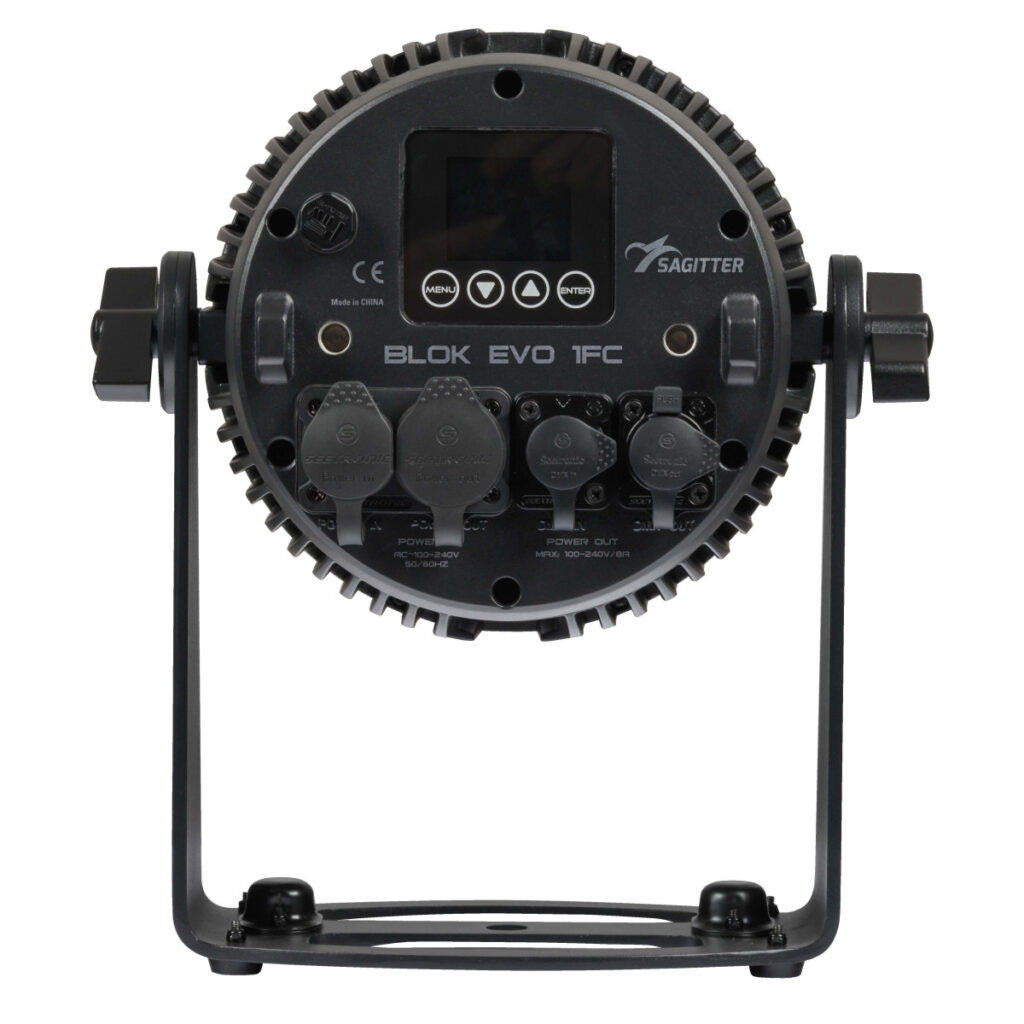 | Structure and cabinet | Die cast aluminium housing LCD graphic display Quick-release anchor points, on-board mechanics for stacking multiple devices “Light up” positioning with adjustable angle Mounting points: 2 pairs of 1/4-turn locks omega bracket IP rating: IP65 DMX 5-poles XLR IN/OUT IP65 connectors Low-noise controlled cooling system |