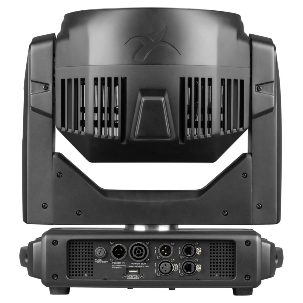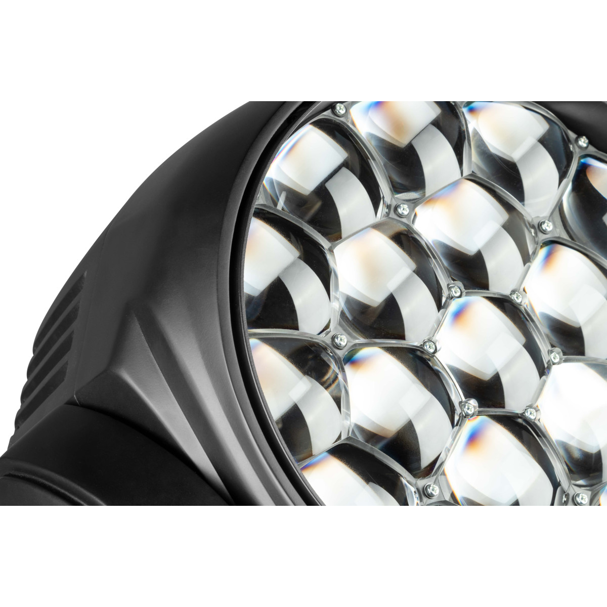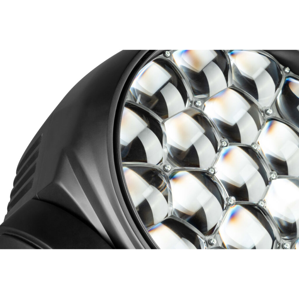 Il sistema ottico è stato concepito per guidare e contenere al massimo il potente fascio luminoso generato dalle sorgenti led mentre l’alta densità e definizione delle lenti frontali offrono un fascio nitido e concentrato, rendendo il proiettore vicino alle prestazioni visive delle più comuni teste mobili beam con sorgente a scarica.