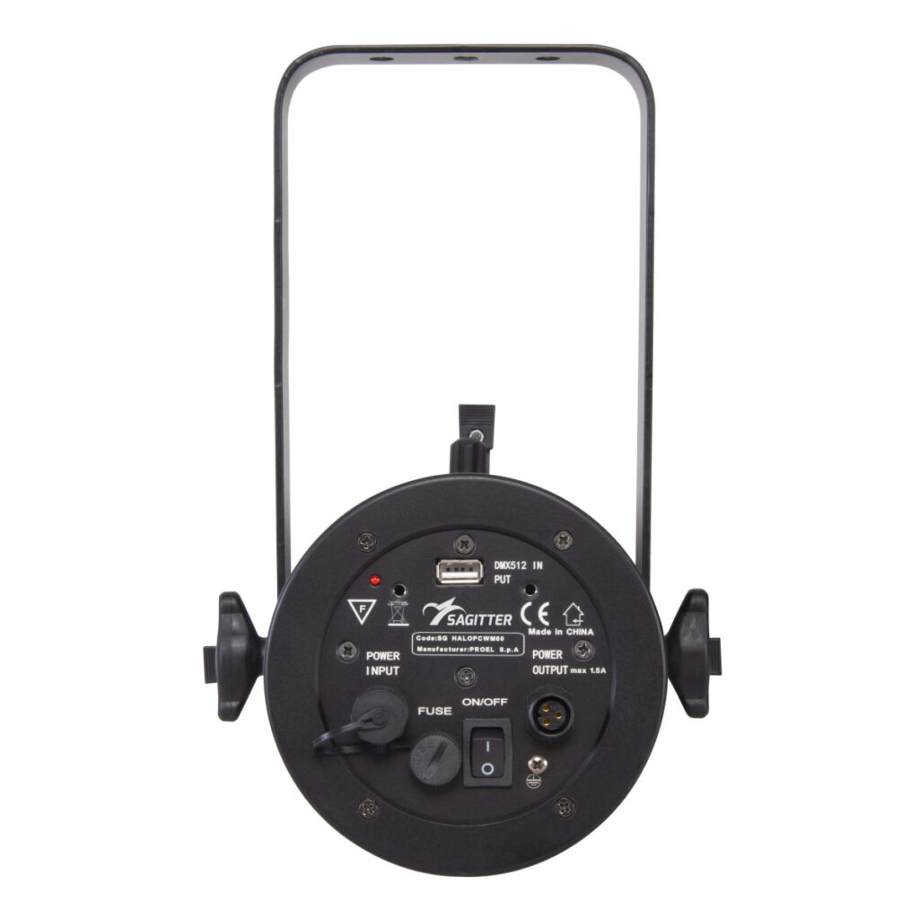 | Struttura e corpo mobile | Struttura in alluminio/plastica ad alta resistenza di colore nero Sistema di ancoraggio con singola staffa Box esterno per impostazione delle funzioni, indirizzamento e controllo manuale del dimmer Connessione di segnale DMX ingresso e uscita XLR 3 poli sul box esterno Grado di protezione: IP 20 Raffreddamento a ventilazione forzata a bassa rumorosità |