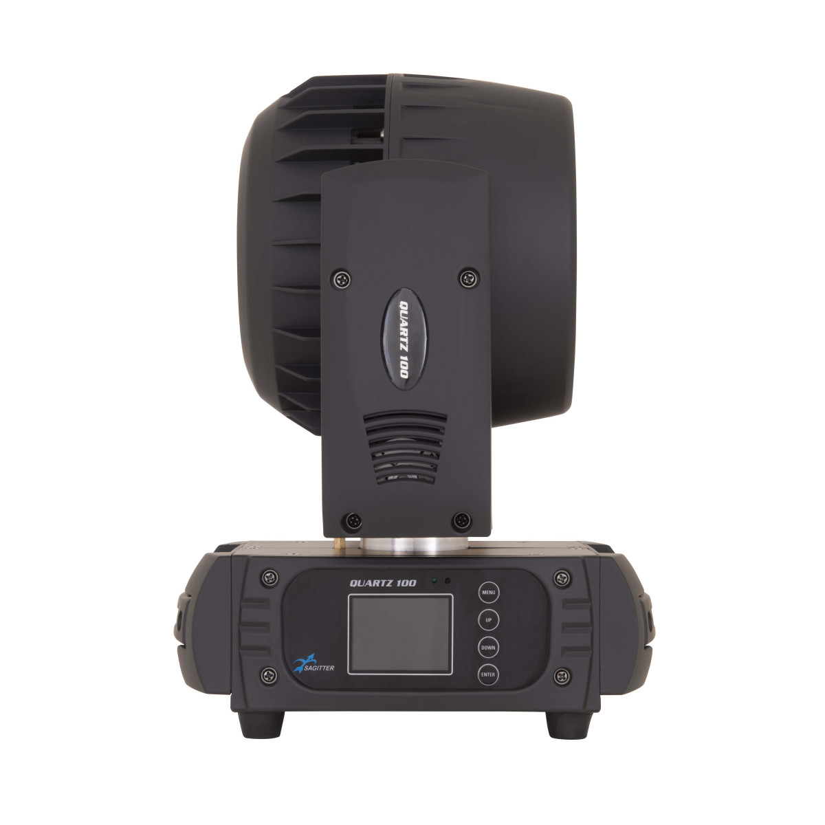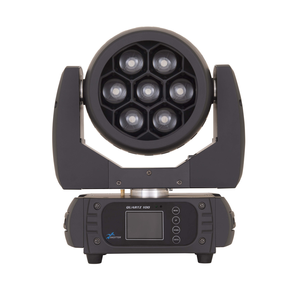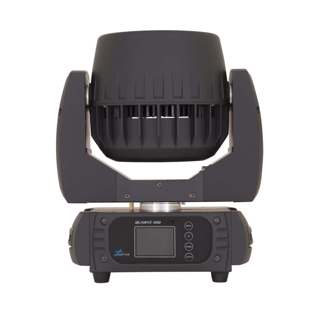Quartz 100 è un innovativo proiettore testa mobile a led che grazie alla sua versatilità, può essere impiegato in molti modi differenti anche all’interno dello stesso show. Le 7 sorgenti led Osram RGBW/FC da 15W di ultima generazione fanno parte di un sistema di sintesi colore basato sull’odierna tecnologia di miscelazione full color che garantisce una elevata illuminazione di superfici e scenografie, garantendo allo stesso tempo brillantezza sull’intera scala cromatica. Quartz 100 grazie all’avanzata tecnologia zoom combinata con guide ottiche dedicate, assicura una perfetta miscelazione dei colori durante il controllo digitale dello zoom variabile da 8° a 62°. L’ampiezza del sistema zoom consente di emettere un fascio stretto e definito simulando un effetto beam, ed allo stesso tempo permette di riprodurre un’illuminazione ampia e diffusa come i classici proiettori wash. Questa nuova serie di proiettori a testa mobile offre all’utilizzatore la possibilità di controllare individualmente ogni singola sorgente led, creando così numerosi effetti grafici che combinati al sistema ottico garantiscono un efficace “air fx”.
